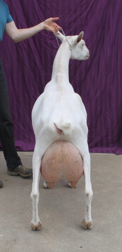 Filigree is a powerful doe with good width and plenty of dairy strength. She has a long elegant neck, prominent brisket and a beautiful front end assembly. She has a beautiful front end assembly and a sweet personality. She is an excellent milker, producing over 4000 pounds of milk as a 2 year old, with a long level lactation. Twice Grand Champion as a Junior, she was also awarded 2018 Jr. Yearling All American. With strong appraisal scores and excellent production, Filigree is more than prepared to be named not only a Superior Genetics doe (SG) but an Elite Doe as well!