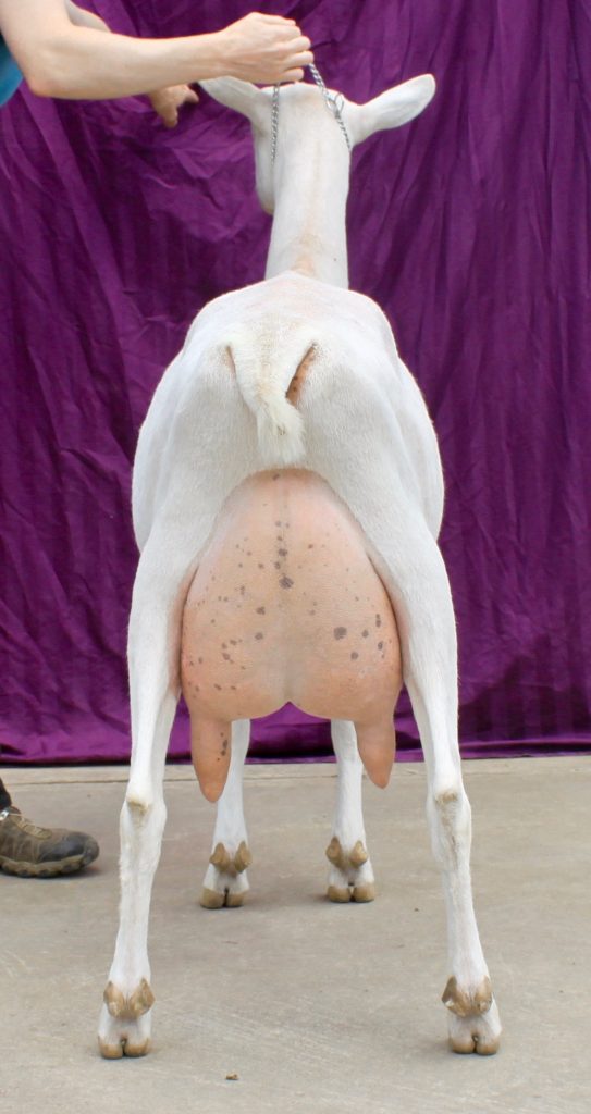 Kementarii has a strong topline, wide and flat rump, very correct front end assembly and a lovely udder that is both high and wide with a very nice medial and like her dam, SGCH Whey-to-Go Nenya, an excellent fore udder. She has excellent rear leg angulation and stands up on strong feet and legs.