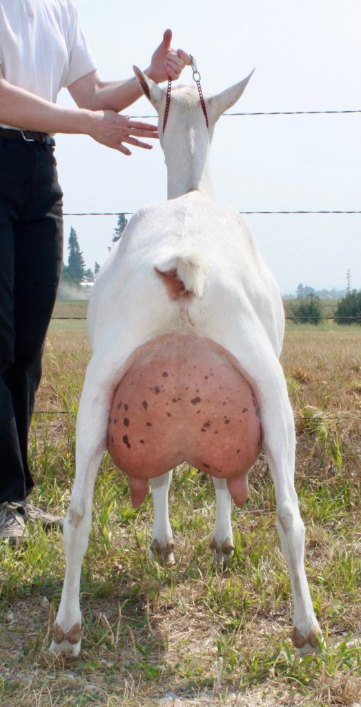 Long and strong and angular, oh my!  Orafina is a dairyman’s dream. With an excellent front end assembly, a long and clean bone pattern, strong feet and legs, wide rump, strong top line and even uphill!  Add in her incredibly wide rear udder (thank goodness for that wide rump and great rear leg set) and gorgeous fore udder and you have a recipe for a doe that is built to produce and to last.