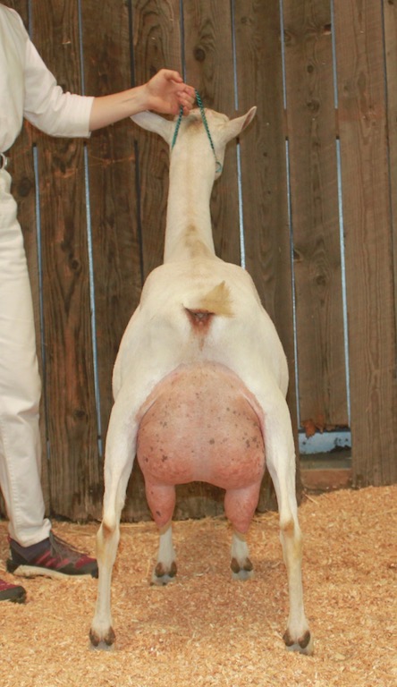 More than just a pretty face, Tamika is a foundation doe par excellence. Included in that is her daughter SG Whey-to-Go Tuppence, who was 2X GCH and 1X RGCH as a Junior Yearling. As a 3 year old Tuppence garnered one GCH, one RGCH and Best Udder in Show! She was also part of our Best Dairy Herd in Show. This year, Tamika’s yearling daughter, SG Whey-to-Go Tipperary was awarded Superior Genetics and is projected for 3480#/milk and 141#/butterfat (4%). Lovely kids with long open bone patterns, exceptional front end assembly, wide flat rumps and udders that are high and wide in the rear with excellent fore extension. We like it!