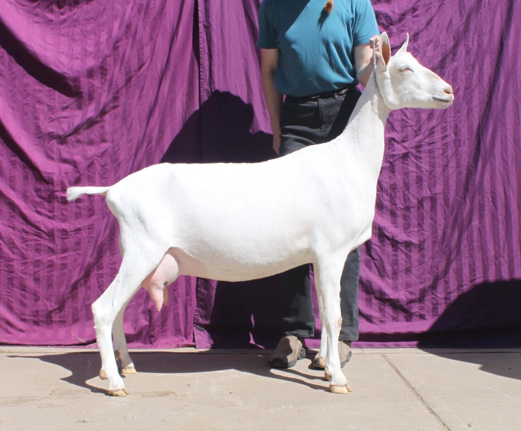 Trieste is a beautiful young doe.  She is long and level with an incredible sweeping stride.  She is very open and dairy with a great deal of strength.  She has a lovely and productive udder that is high and wide with very nice teat placement.  She is so easy going and matter of fact and so easy to hand milk – a joy in the milk parlor.  She and her sister, Tuscany, continue to mature very nicely.  Greatly looking forward to that 2 year old maturity with their 2nd freshening.