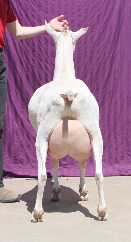 Long, tall and elegant, Varda is very like her dam, SG Whey-to-Go Valinor, but with more body capacity at similar ages. She carries that wide flat rump that is typical of the Jewel line as well as those strong feet and legs. She is a powerful doe – very athletic – with excellent dairy strength. We love the front end on this very balanced doe. Clearly the judges agreed, as they placed her first in her class and RGCH Jr. doe at her first show. She was also awarded NSBA Junior All American Doe.